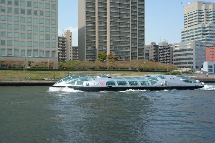 | 松本零士氏がプロデュースした水上バス「ヒミコ」とすれちがった | 新大橋、左岸は首都高速6号線 |