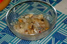| 家に帰ってから”マテ貝”を料理しました。 軽く酒蒸して、たまねぎとともにナンプラーとレモン そしてプリッキニー(タイの唐辛子)で和えて ”マテ貝のタイ風和え物”のできあがり! ビールに最高です! |