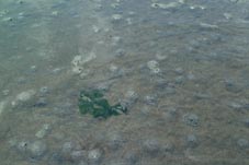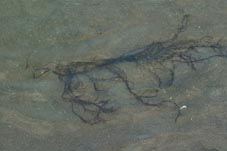 | 中央の緑色のものは”アオサ”、周りのトグロを巻いた砂は 別名”干潟のモンブラン” ゴカイの一種のお家です。 海底の有機物を食べて海をきれいにしています |